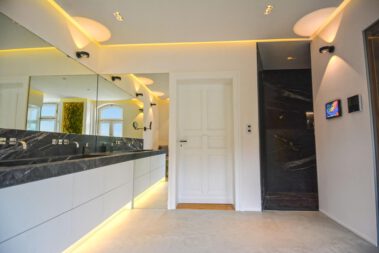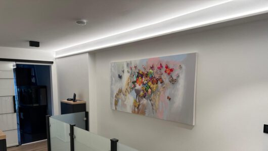 Dieser wurde nicht nur zur Leitungsführung genutzt, sondern gleichzeitig mit einer indirekten, dimmbaren LED-Beleuchtung ausgestattet. So entstand eine stimmige Lichtlösung, die für angenehmes, blendfreies Licht sorgt und den Flur optisch aufwertet – technisch durchdacht und gestalterisch dezent integriert.