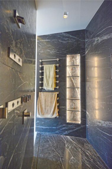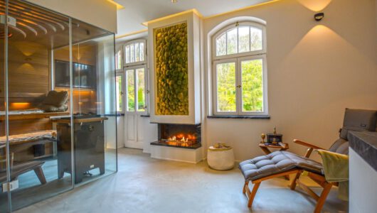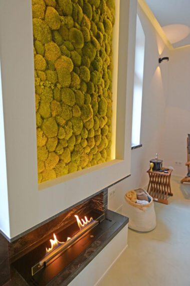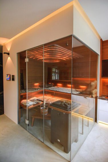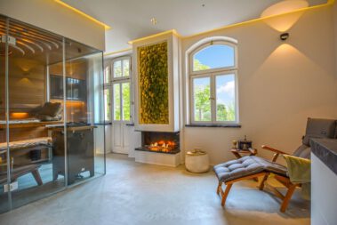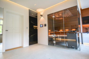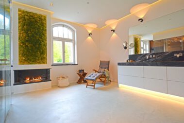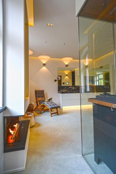 Für ein angenehmes Raumklima sorgen eine elektrische Fußbodenheizung und ein stilvoller Bioethanolkamin, die Wärme und Wohlfühlatmosphäre perfekt miteinander verbinden. Durch die Kombination aus innovativer Technik und hochwertiger Ausführung entstand ein exklusiver Wellnessbereich